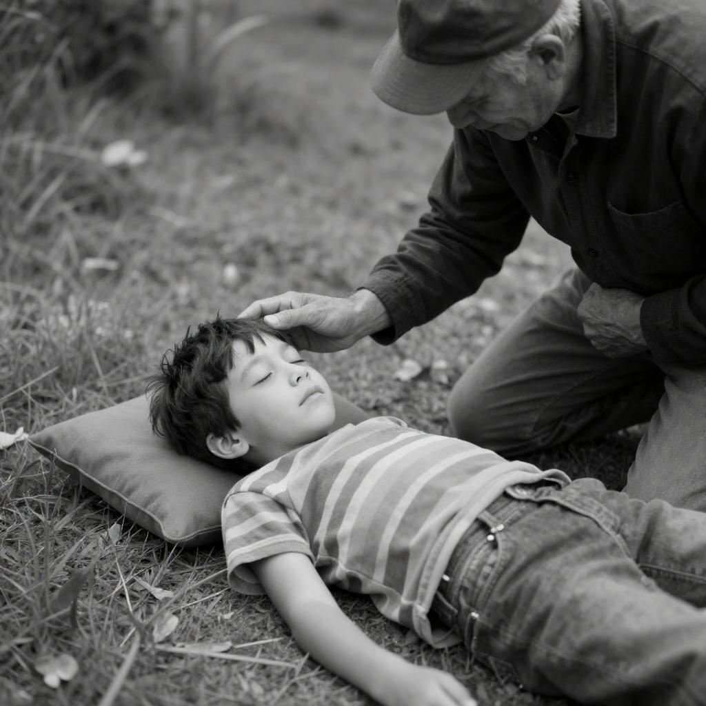 Black-and-white photograph of a young boy with short dark hair, wearing a striped shirt and jeans, lying on the ground with eyes closed. An older man in a hat and dark clothing kneels beside him, gently touching his forehead. Background includes grass and blurred foliage. The boy's relaxed posture contrasts with the man's attentive, caring gesture.