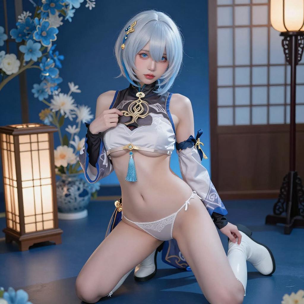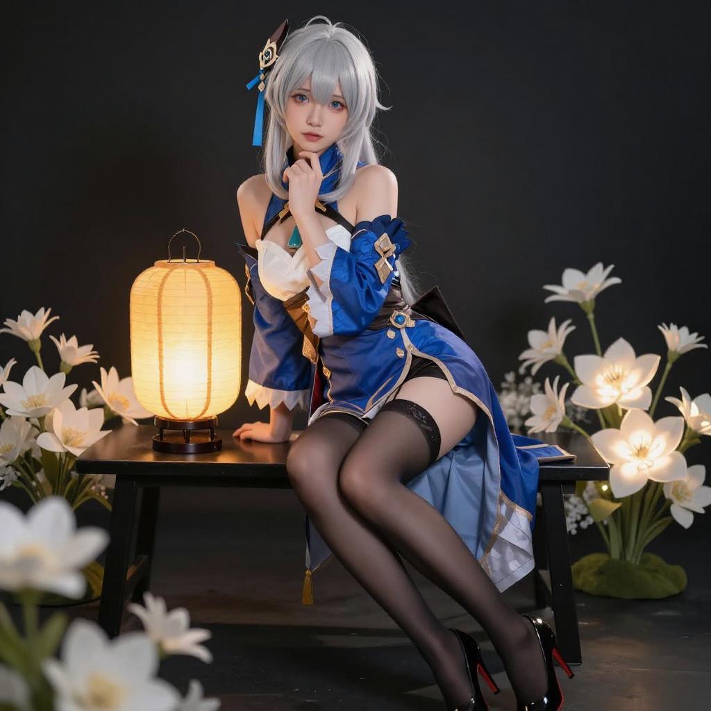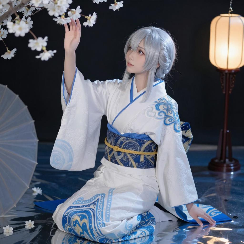 Digital artwork of a silver-haired anime girl in a white and blue traditional outfit, kneeling on a reflective blue surface. She holds a blue fan, surrounded by glowing lanterns and white flowers. A black lantern stands behind her, with cherry blossoms in the background. Her expression is serene, and her pose is graceful.