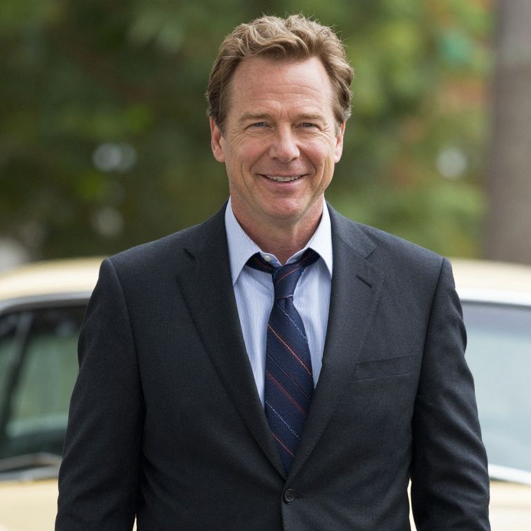 Photograph of a middle-aged white man with light skin and short, slightly tousled brown hair, smiling at the camera. He is wearing a dark navy blue suit with a white dress shirt and a dark blue, diagonally striped tie. The background is blurred but suggests an outdoor setting with green foliage and a white car partially visible. The man's expression is friendly and approachable. The lighting is natural, highlighting his face and upper body. The overall composition focuses on the man, with a shallow depth of field that keeps the background out of focus.