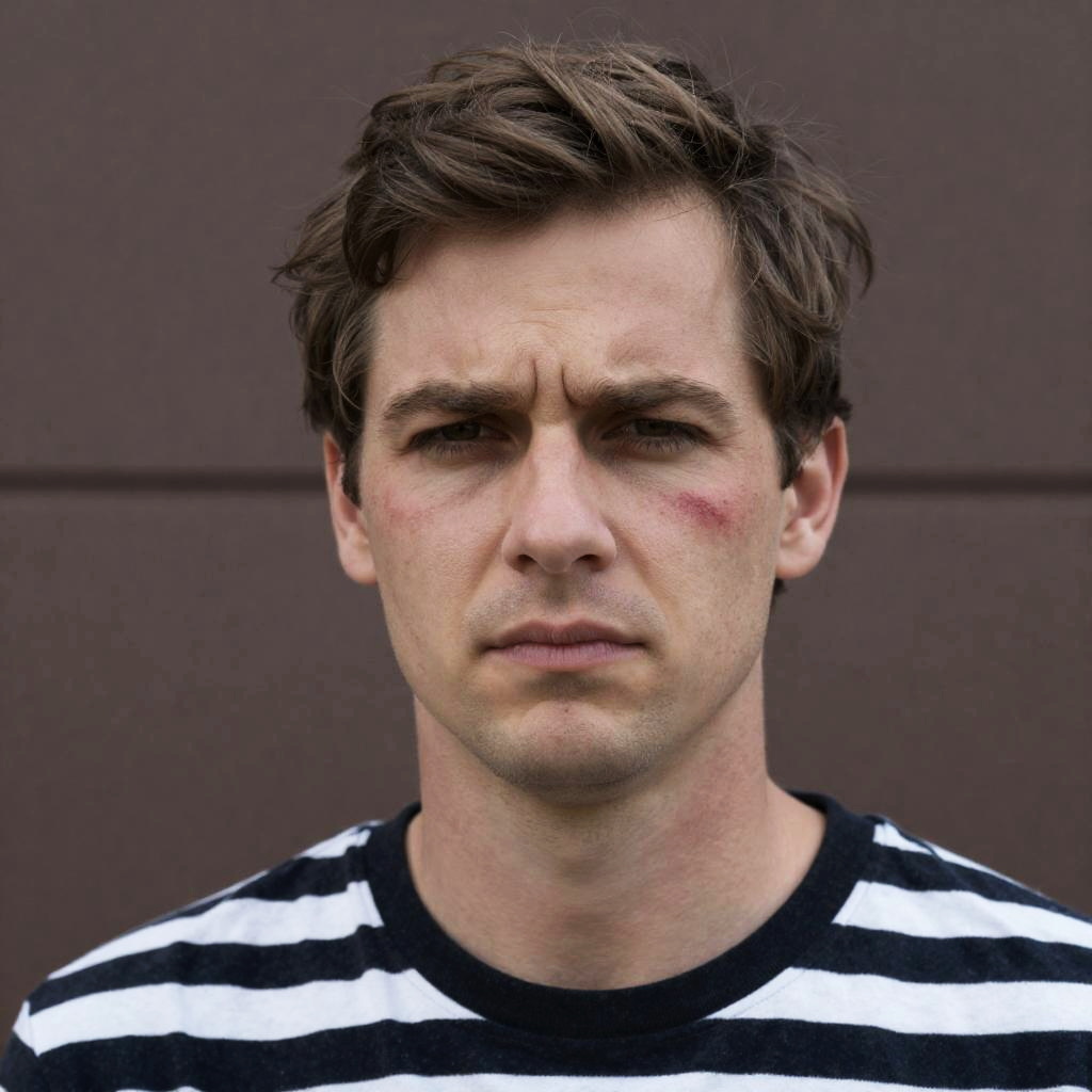 Photograph of a man with light brown hair, slightly disheveled, wearing a black and white striped shirt. He has a visible cut on his left cheek, slightly furrowed brow, and a neutral expression. Blurred brown background. Close-up shot.
