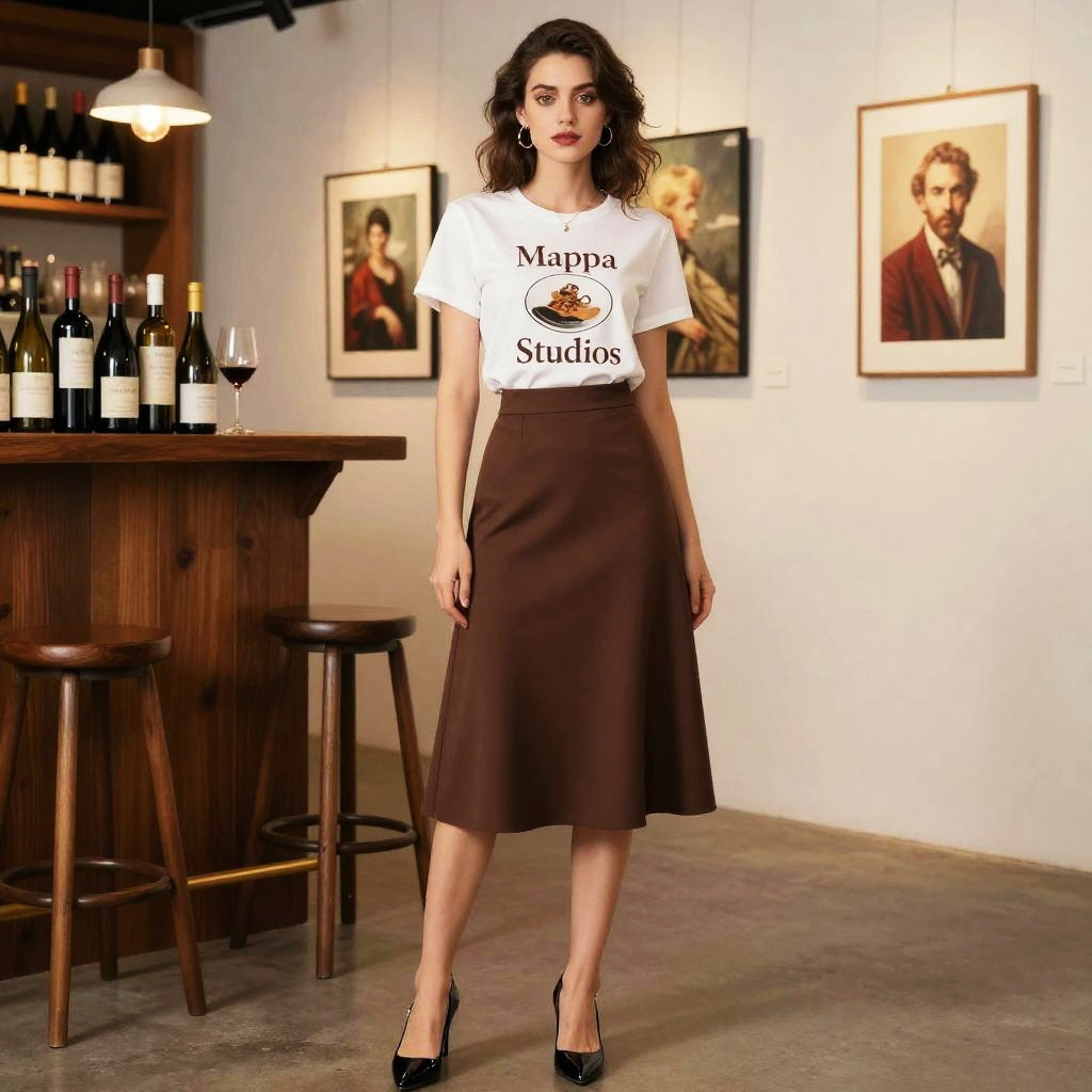A woman in a vintage-inspired white tee and chocolate brown A-line midi skirt stands at a wine bar art gallery setting, exuding elegance with her black patent leather pumps. The scene captures the essence of mappa studio's visual style. Sexy. Pretty face and beutiful eyes