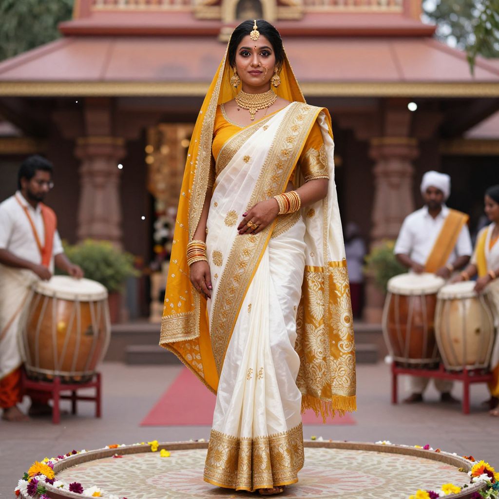 A bridal woman with golden brown skin, large round eyes, and a delicate nose, wearing a luxurious Baluchari saree in saffron and white with intricate gold zari work, standing on a traditional wedding platform in a temple courtyard during a festive event with drums and flowers in the air.. The woman has big breasts and cute face