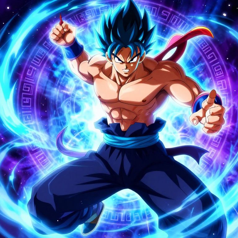 A vibrant digital anime illustration depicts a muscular, shirtless male character with spiky blue hair and intense blue eyes, reminiscent of Goku from Dragon Ball Z. He is mid-action, fists clenched, wearing dark blue pants with a blue sash and black wristbands. His skin is fair, and he exudes power with glowing blue energy swirling around him. The background features a circular, glowing purple and blue pattern with intricate designs. His red scarf is prominently flowing to the right. The dynamic composition and bright colors emphasize his strength and energy.