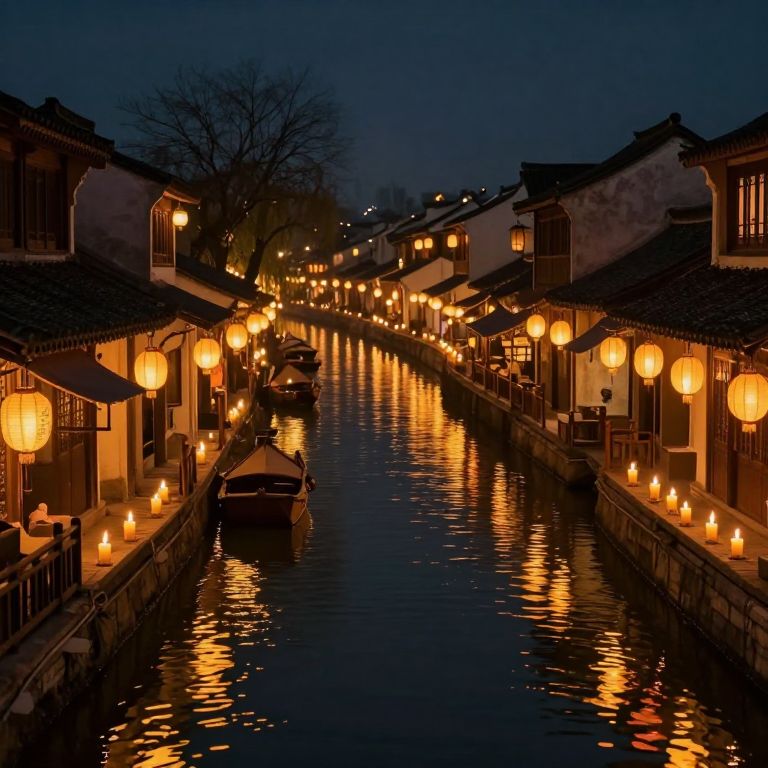 Photograph of a nighttime canal scene in an Asian-style village, illuminated by numerous glowing orange paper lanterns hanging along the sides of the narrow waterway. The lanterns reflect warmly on the dark, calm water, creating a shimmering effect. Traditional wooden buildings with tiled roofs line both sides of the canal, with small tables and chairs visible under the lanterns. A few boats are moored along the sides. The sky is dark blue, and leafless trees are visible in the background. The overall atmosphere is serene and picturesque, with a focus on traditional Asian architecture and warm, inviting lighting.