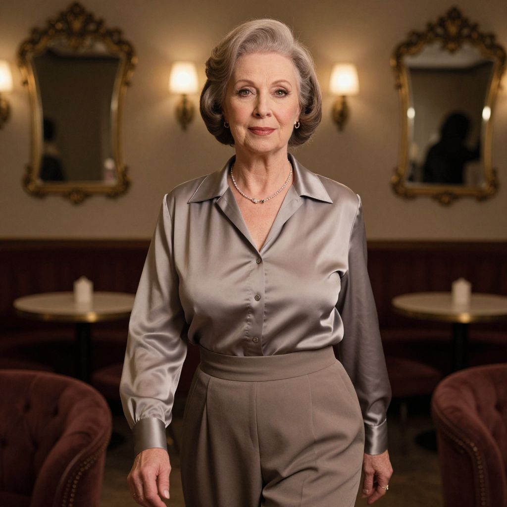 Photograph of an elegant elderly woman with short gray hair, wearing a silky gray blouse and high-waisted pants, standing in a warmly lit,
