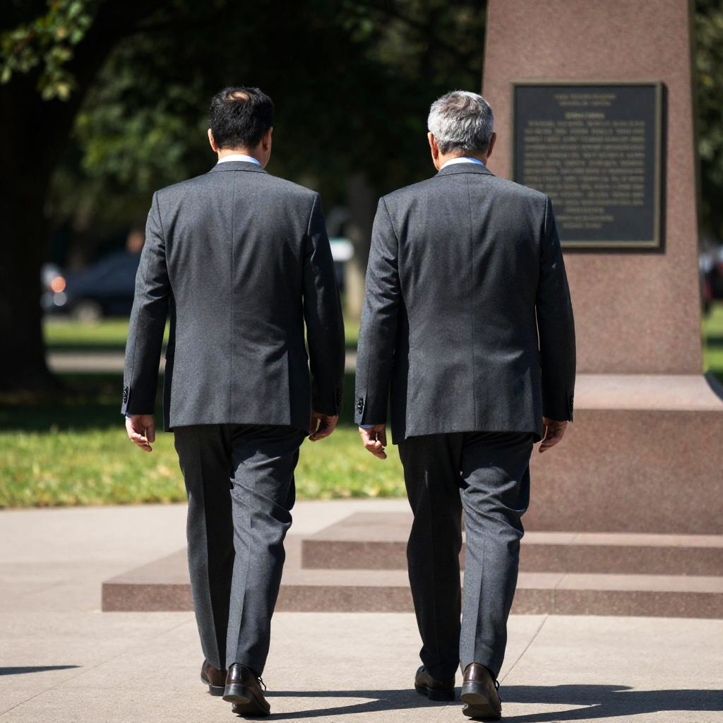 Photograph of two men walking away from a brown monument with a plaque, trees, and grass in the background. Both men wear dark gray suits and blue shirts, one with dark hair, the other with lighter hair. The monument is on the right, with sunlight casting shadows.