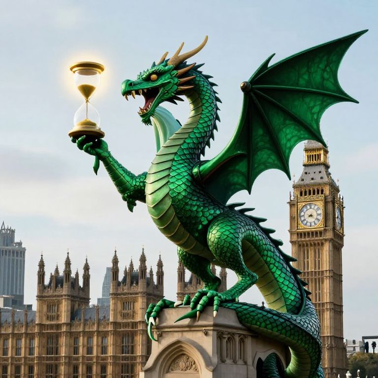 A majestic green dragon coils gracefully around the iconic Elizabeth Tower, its vibrant scales contrasting against the historic stone structure as it holds a floating hourglass aloft with its tail, casting an ethereal glow over the London skyline.