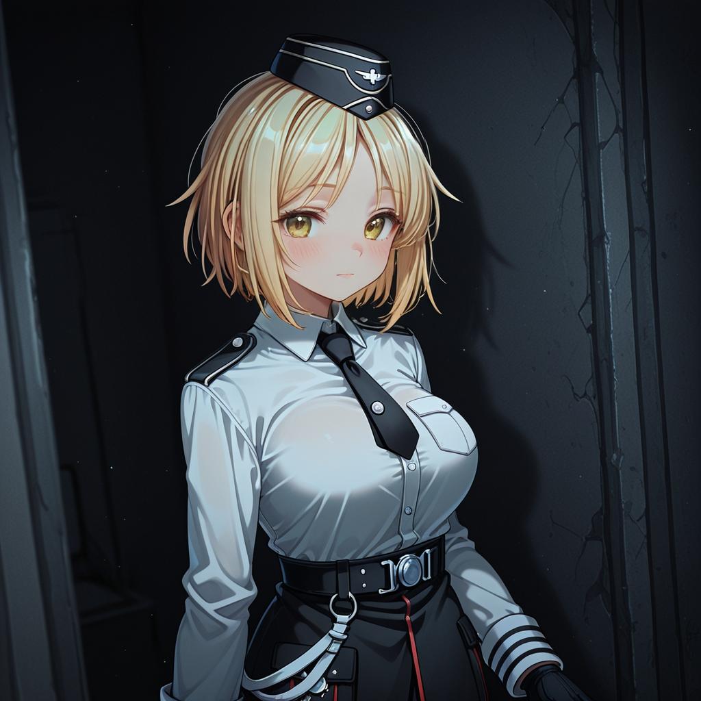 Mp40 (girls' frontline), girls' frontline, 1girl, brown eyes, blonde hair, short hair, large breasts, military uniform, garrison cap, military uniform, black gloves, military hat, white shirt, black headwear, long sleeves, by artist ibaraki natou, dark_illustrious