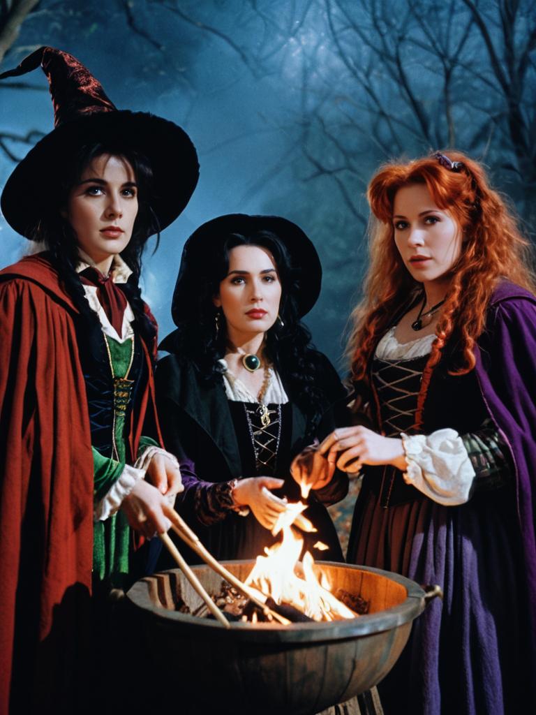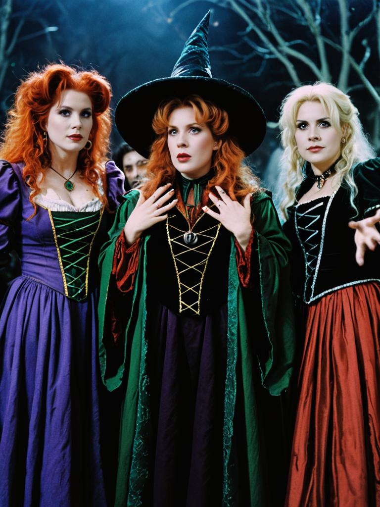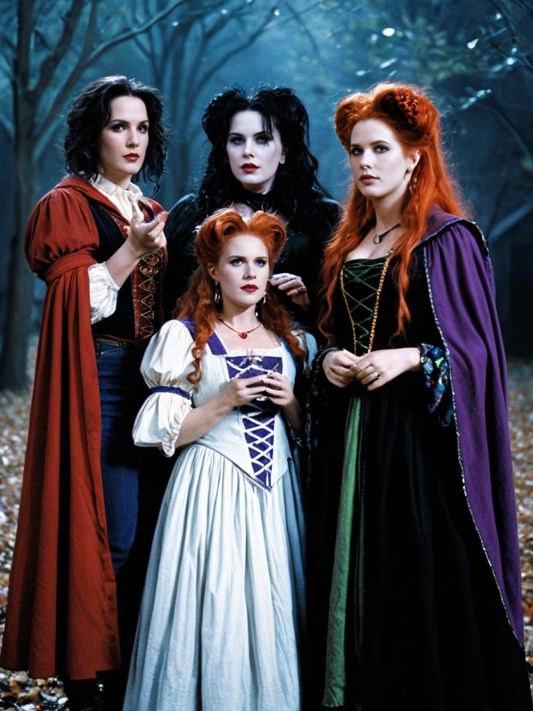 Group in Hocus Pocus Cosplay, cinematic realism, theatrical editorial shot