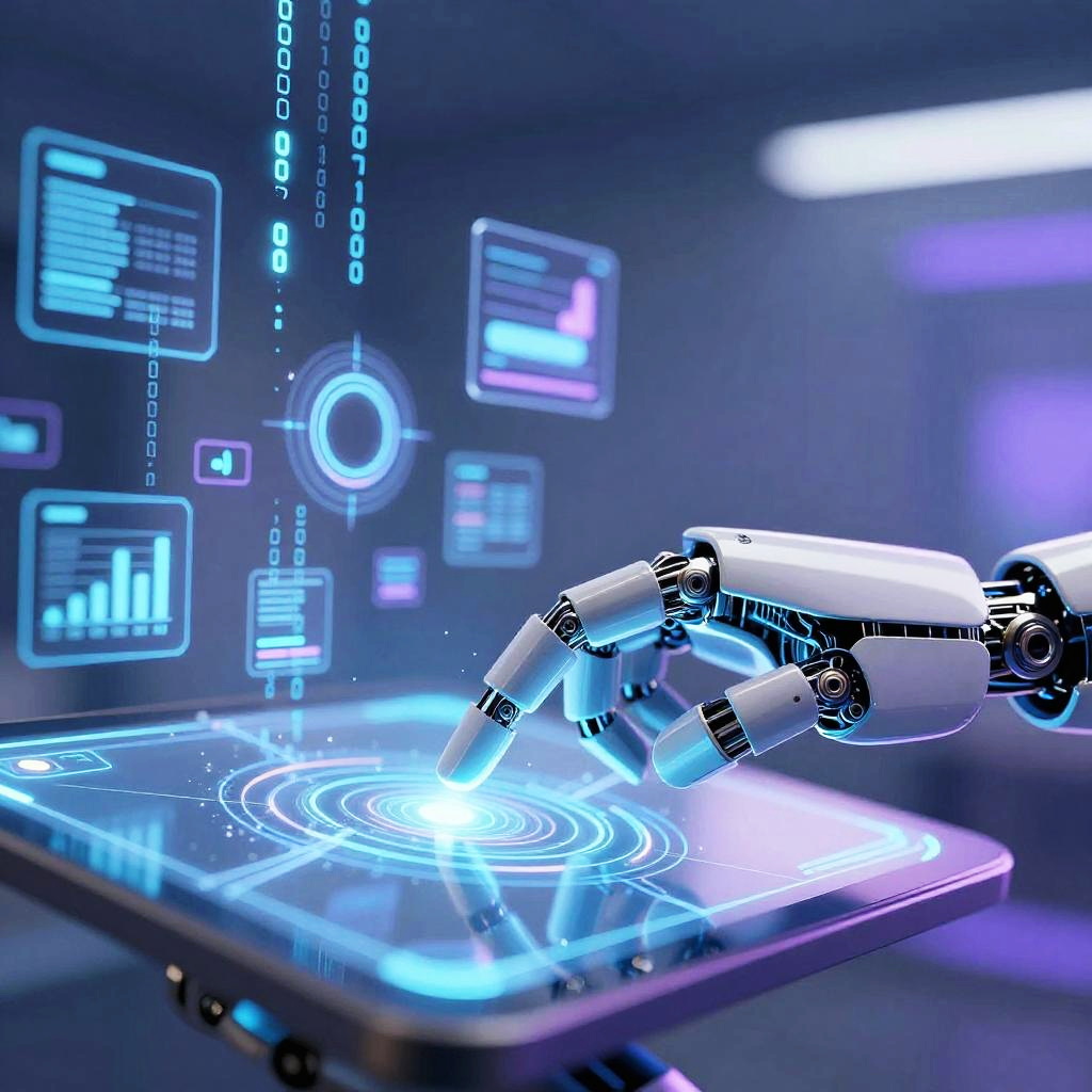 AI generated online concept art of a robotic hand interacting with a virtual touchscreen, surrounded by floating 3D data visualizations and digital code rain, set in a high-tech environment with soft glowing blue and purple hues, emphasizing innovation and technology.