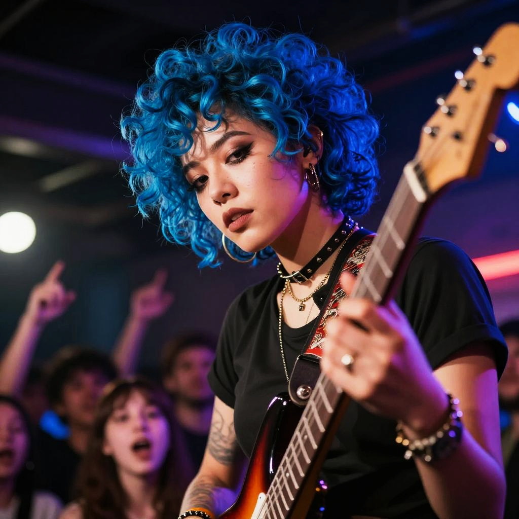 Close-up of a confident blue hair curly punk rocker performing on stage, electric guitar, colorful lighting, energetic crowd, urban grunge style, dynamic composition