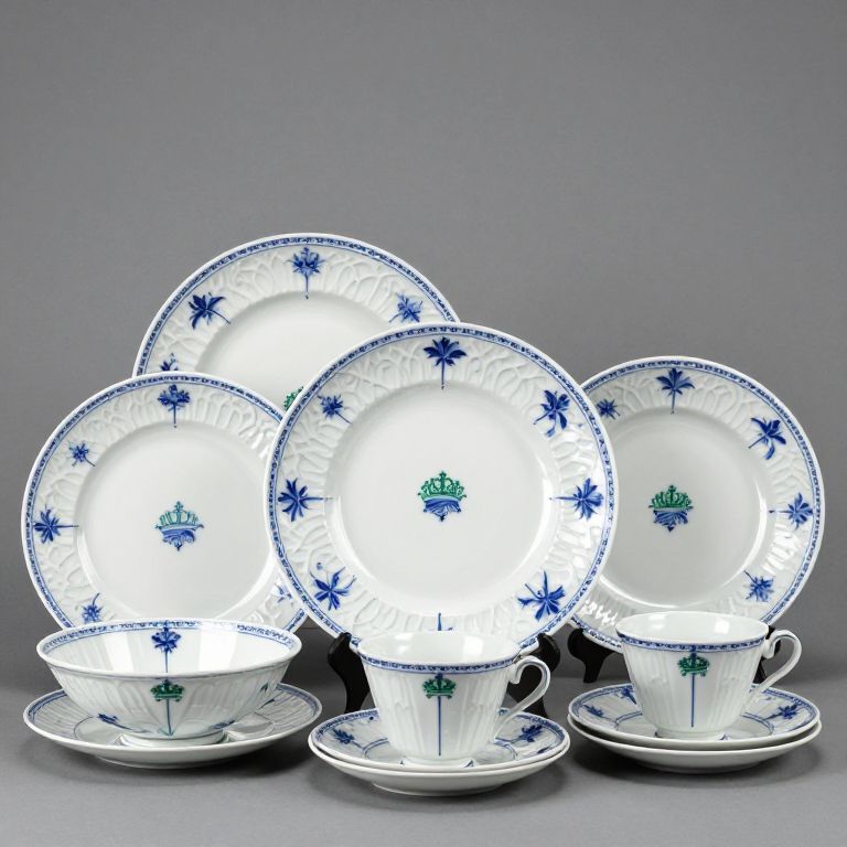 Royal Copenhagen Porcelain 'Flora Danica' part dinner service from the 20th century, featuring three intricately decorated plates with blue floral patterns and green accents, a matching bowl, and a set of six saucers with a cup, all bearing the Blue Wave and Green Printed Crown marks, showcasing Pattern No. 20.