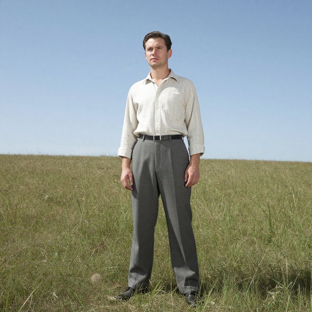 A man stands confidently in a grassy field under a bright, sunny sky. The image conveys a sense of calm and connection with nature, drawing inspiration from classic film styles.