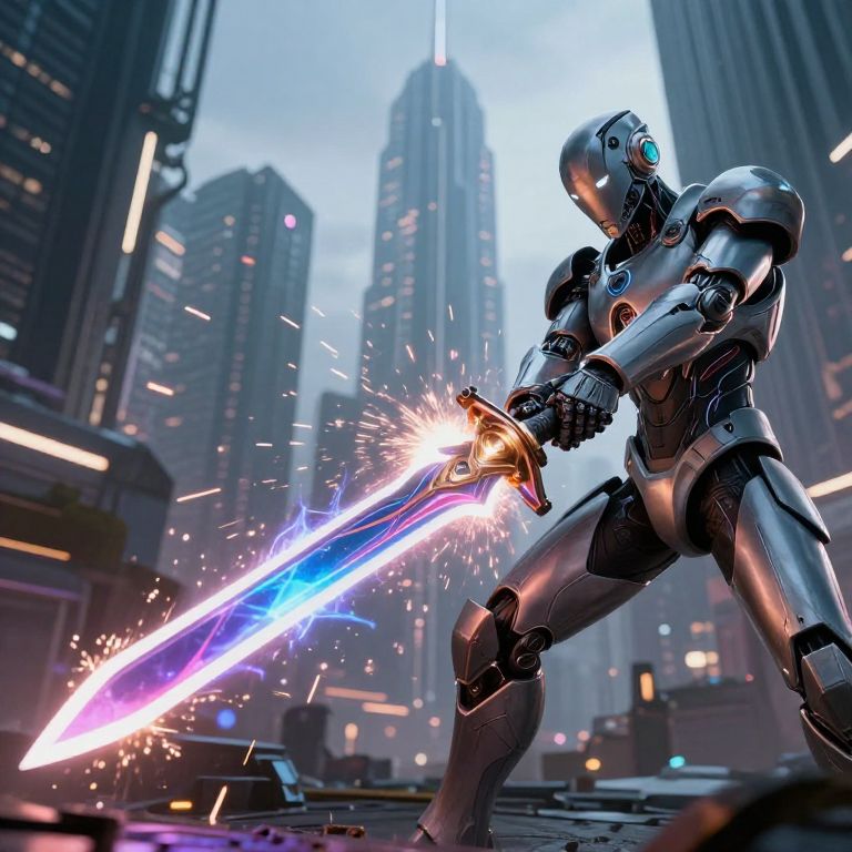 CGI image of a futuristic, armored robot warrior wielding a glowing blue and purple sword, sparks flying, in a neon-lit urban cityscape with