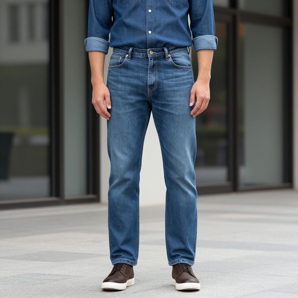 Photograph of a person standing outdoors, shown from the waist down. They are wearing blue denim jeans with slightly faded areas, a matching blue denim shirt with sleeves rolled up, and brown leather shoes with white soles. The background is slightly blurred, featuring large glass windows and a gray building. The person's hands are relaxed by their sides. The image has a vibrant, slightly over-saturated color style, emphasizing the denim fabric. The ground is a smooth, light-gray pavement.