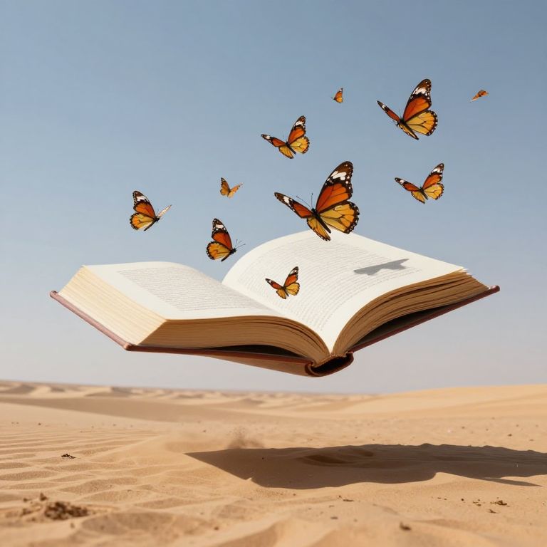 A colossal, open book hovers serenely above a desolate desert landscape, its pages alive with swirling butterflies, defying gravity and inviting the viewer into a realm where stories take flight.