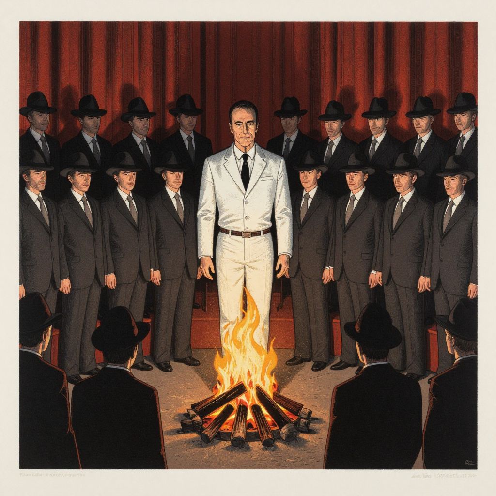 Dean Cornwell Choir of men in suits and hats around a fire burning an effigy of Leonard Cohen, Conspiracy of Beards, block print,