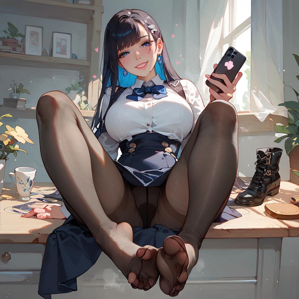 (score_9, score_8_up, score_7_up, score_6_up, score_5_up, score_4_up), source_anime, 1girl, tatsumaki, one-punch man, licking lips, small breasts, shiny skin, sitting on chair, frilled shirt collar, white shirt, dress shirt, black skirt, pencil skirt, pantyhose, foot focus, foreshortening, dynamic angle