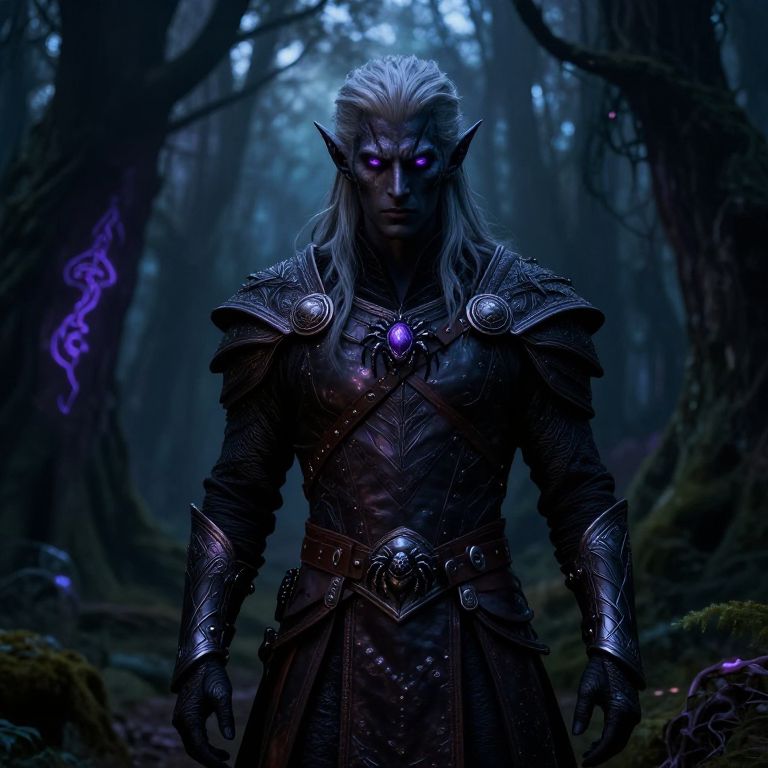 Male drow elf standing in a mysterious enchanted forest at twilight, dark skin shimmering faintly, silver hair flowing, piercing violet eyes, clad in intricate leather armor adorned with spider motifs, surrounded by glowing magical runes and creeping shadows.