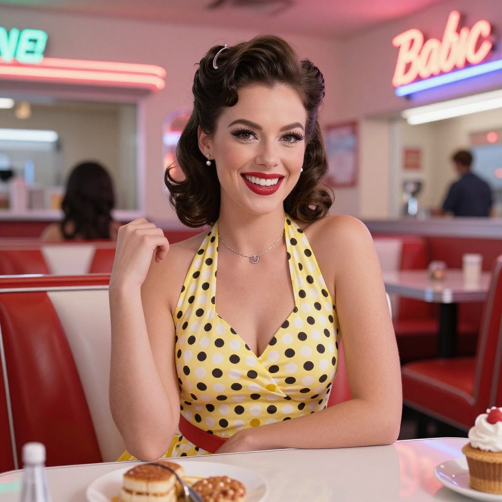 A cheerful woman dressed in a vintage 1950s polka dot halter dress sits at a diner booth, smiling confidently with retro-styled hair and makeup. The warm ambiance of the diner, complete with neon signs and classic decor, evokes a nostalgic mid-century American diner atmosphere.