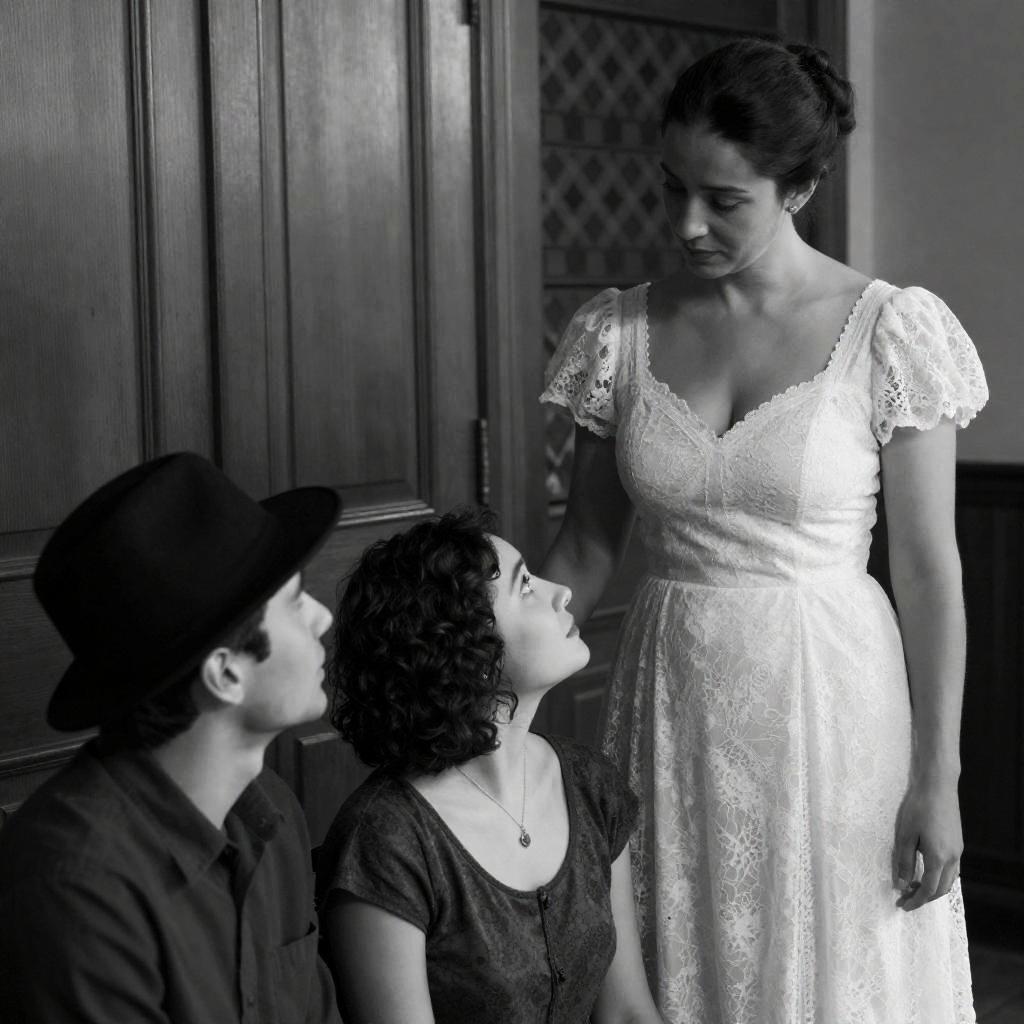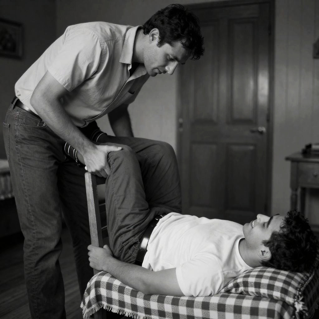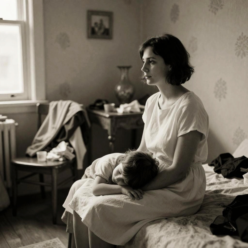Black-and-white photograph of four people in a rustic wooden room. Woman in lace dress stands, leaning on chair back. Man in vest and tie stands beside her. Boy in hat and shirt stands to left, holding another boy bent over. Wooden walls, patterned chair, and bed in background.