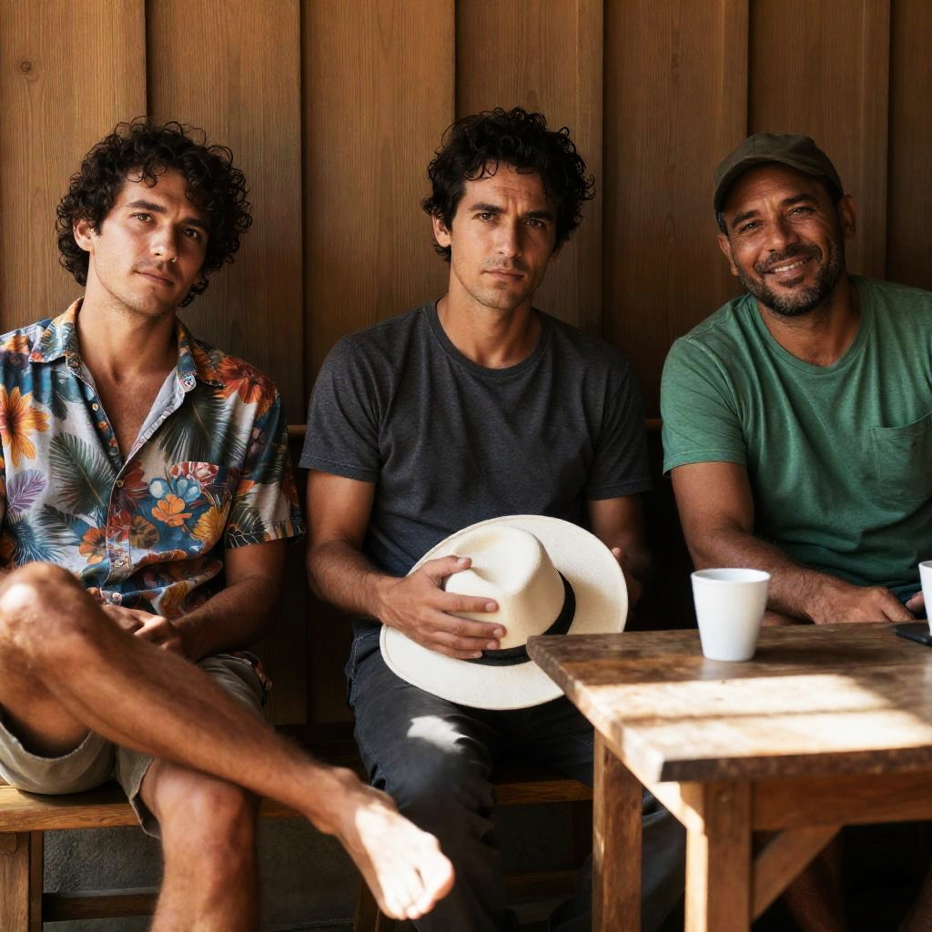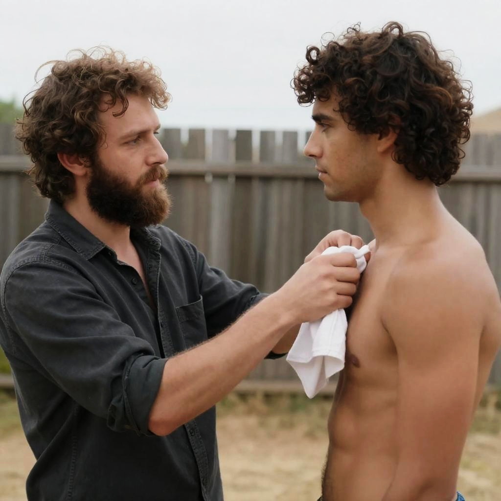 Two men standing against a stone wall, conversing. The man on the left has curly hair, wears a green jacket and brown pants, with hands in pockets. The man on the right has a beard, curly hair, wears a gray jacket over a blue shirt, gesturing with his right hand. A trash can is on the right. Both look at each other.