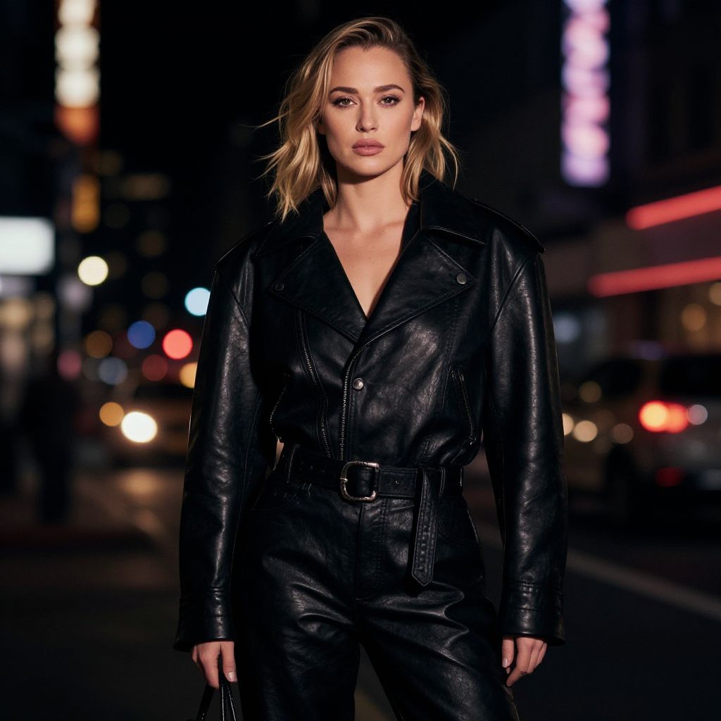 Photograph of a stylish blonde woman with sunglasses, standing confidently in a red-lit hallway. She's wearing a black wide-brimmed hat, black leather jacket, black tank top, black shorts, black gloves, and white high-top sneakers. Her outfit is edgy and modern, with a casual yet bold vibe. The background shows a blurred man in a suit walking away, with a blue sign overhead.