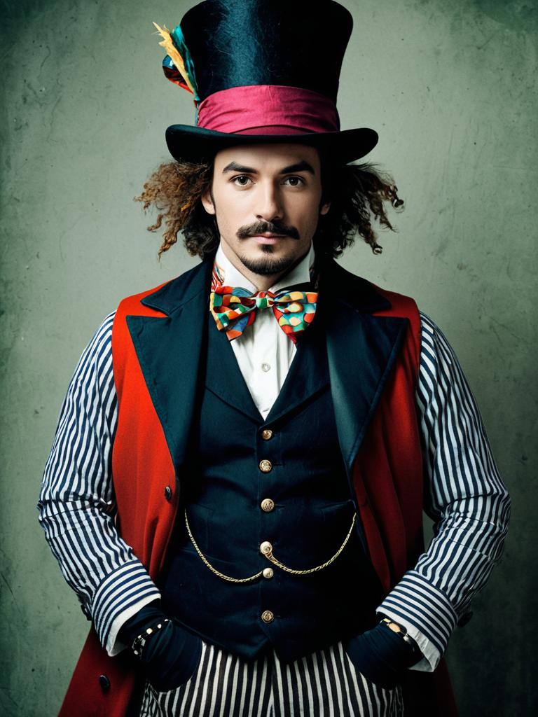 Funny duos costume, 1girl, 1boy, hat, flower, coat, pants, pantyhose, red pants, facial hair, standing, mustache, long hair, boots, hands in pockets, black headwear