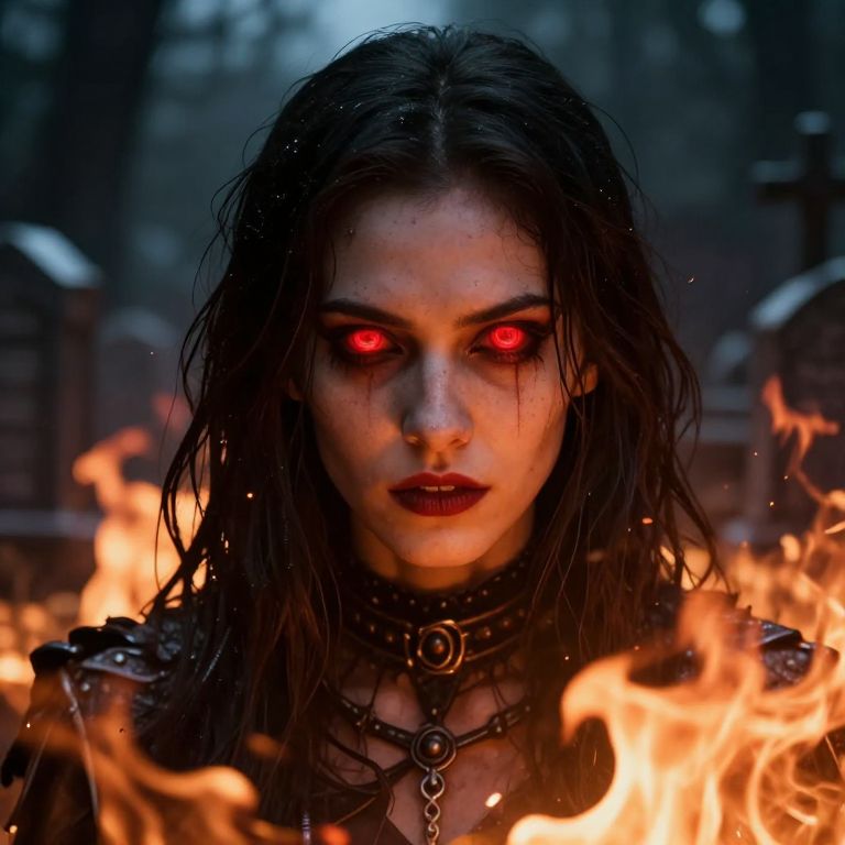 A hyper-realistic, cinematic portrait of a character with neon red eyes, surrounded by flames, set in a dark, detailed environment reminiscent of a cemetery.