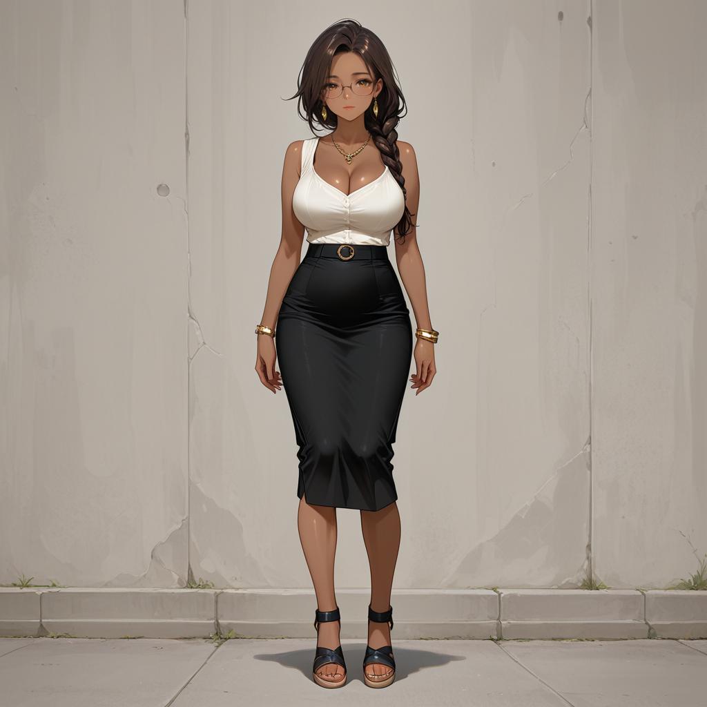 Full body illustration of a confident dark-skinned woman with long brown braided hair and glasses. She is wearing a white sleeveless top, a high-waisted black pencil skirt, black sandals, and gold jewelry including earrings, bracelets, and a necklace. The woman stands against a neutral light wall, looking directly at the viewer.