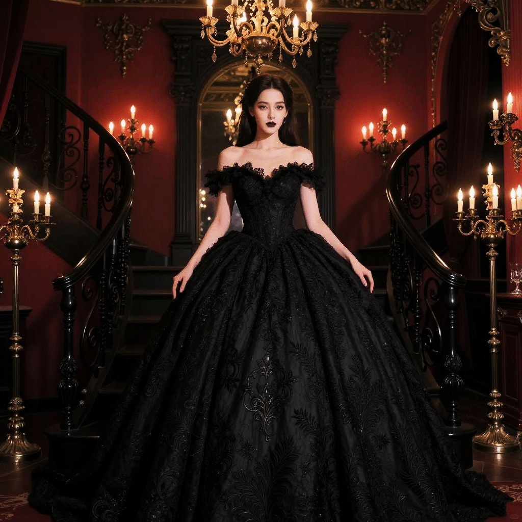 A photograph of a dark-haired woman in an opulent, dimly-lit room with ornate walls. She's wearing an elaborate, black, off-the-shoulder gown with lace sleeves and a choker, standing confidently with her hands clasped in front. Two grand chandeliers with lit candles hang from the ceiling, casting a warm glow against the dark background. The overall vibe is gothic and elegant.