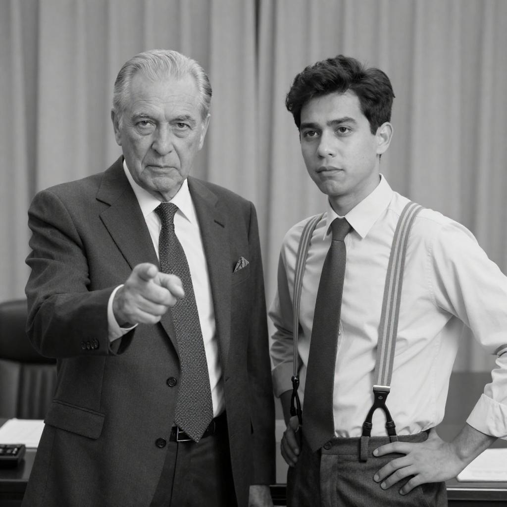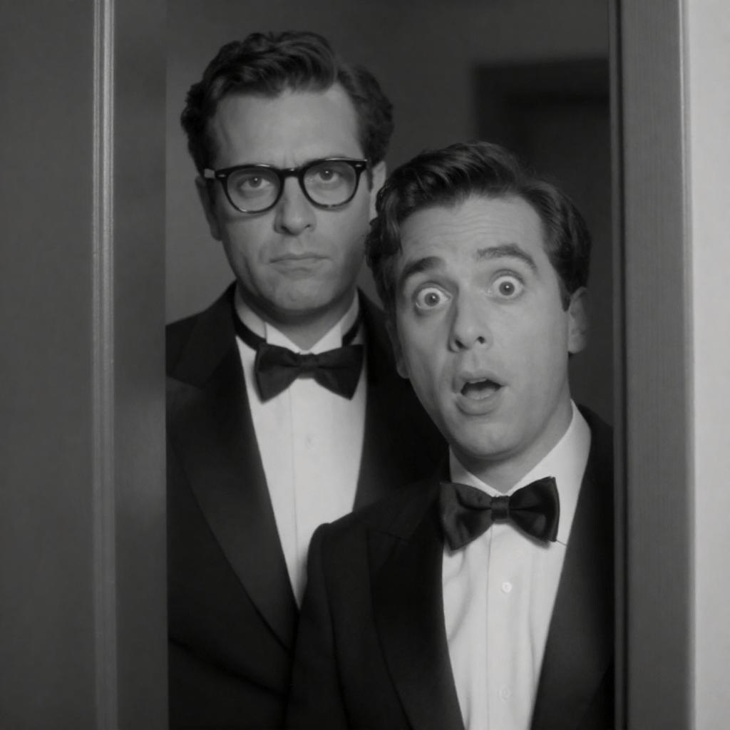 Black and white photograph of two men. The man on the left wears a patterned bowtie, checkered suit jacket, and buttoned shirt. He has thinning hair and a slightly annoyed expression. The man on the right has dark, wavy hair and wears a light-colored sweater over a collared shirt. He looks towards the camera with a neutral expression. Background shows a blurred indoor setting with shelves and lights. Both men are seated close together.