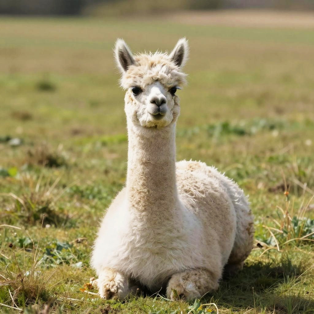 A gray Alpaca sitting in the middle of a sunny meadow, inspired by Georgia O'Keeffe, soft and warm lighting, peaceful atmosphere