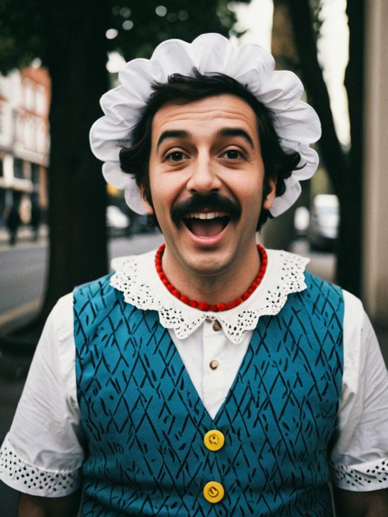 Person in Funny Fancy Dress Outfit, cinematic realism, playful comedic portrait