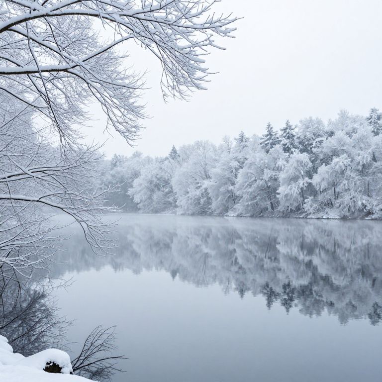 Photograph of a serene, snow-covered lake reflecting frosty trees and overhanging branches, with a white, overcast sky.