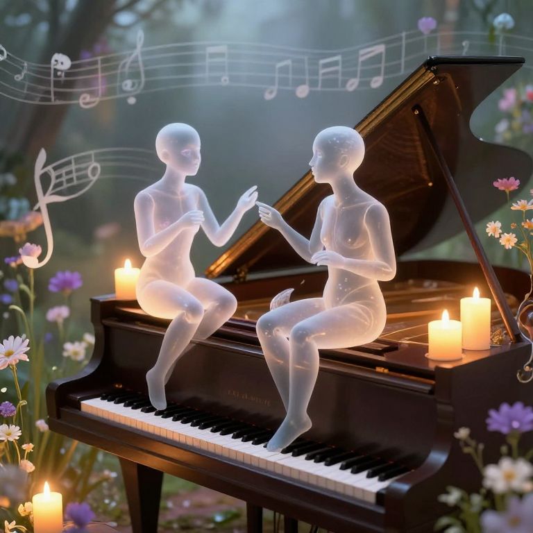 Photograph of a surreal, ethereal scene featuring two translucent, white, statue-like figures sitting on a black grand piano. Both figures are nude and appear to be singing or playing an invisible piano, with musical notes floating above them. The piano has three lit candles on the left, right, and center, casting a warm glow. The background is a blurred, magical forest with soft blue and green hues and scattered daisies. The scene combines realism with fantasy, blending natural elements with the surreal, ghostly figures.