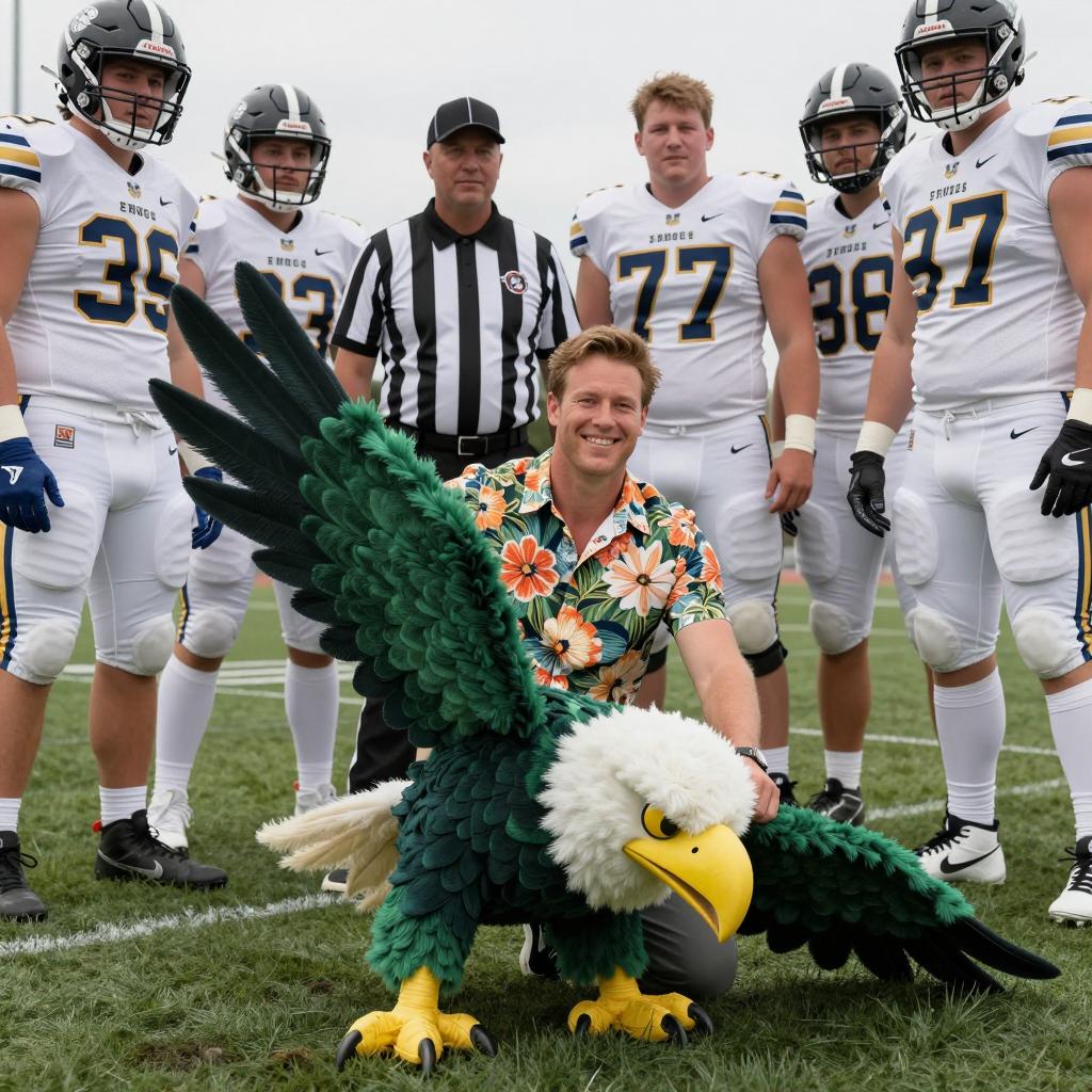 Three female hockey players in white jerseys with a penguin , blue and black gloves, and helmets. They are kneeling, smiling, and raising their gloved hands. The player on the right has dark hair and a wide smile. The player in the middle has short blond hair and a neutral smile. The player on the left has dark hair and an open-mouthed smile. The background shows a red railing and blurred spectators. The player in the middle holds an American flag decal helmet. The jersey numbers are 00 and 04.