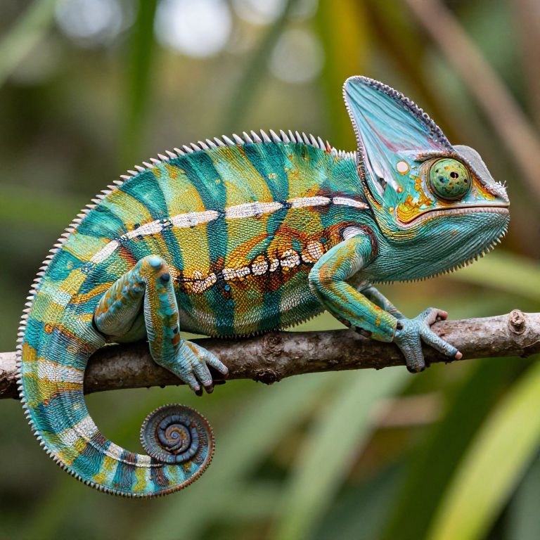 Close-up photograph of a vibrant, multicolored chameleon with blue, green, and yellow stripes, sitting on a branch in a blurred, green