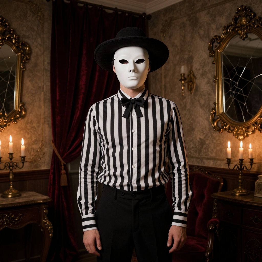 A man wearing a black and white striped shirt with a black collar and a black bow tie stands confidently in a dimly lit, vintage-inspired room filled with soft shadows and an atmospheric, slightly surreal ambiance. He wears a full white mask that completely covers his face, giving him a mysterious and enigmatic appearance, and a wide-brimmed dark hat rests neatly on his head, adding to his otherworldly presence. His posture is upright and deliberate, exuding quiet authority. The room features aged furniture, flickering candlelight, and subtle textures that enhance the vintage aesthetic—deep red velvet curtains, cracked mirrors, and old brass fixtures. The interplay of light and shadow creates a dreamlike tension, deepening the sense of intrigue and timeless secrecy. The overall mood is hauntingly elegant, blending nostalgia with a touch of the uncanny.