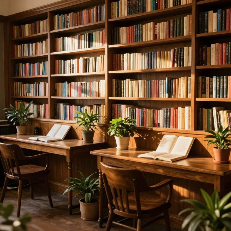 An inviting library bathed in golden-hour light, featuring wooden bookshelves brimming with novels, cozy reading desks adorned with open books and potted plants, and warm, vintage-inspired decor that evokes a sense of timeless literary exploration.