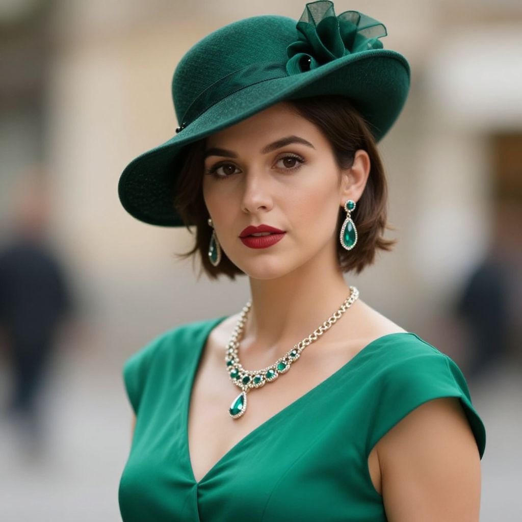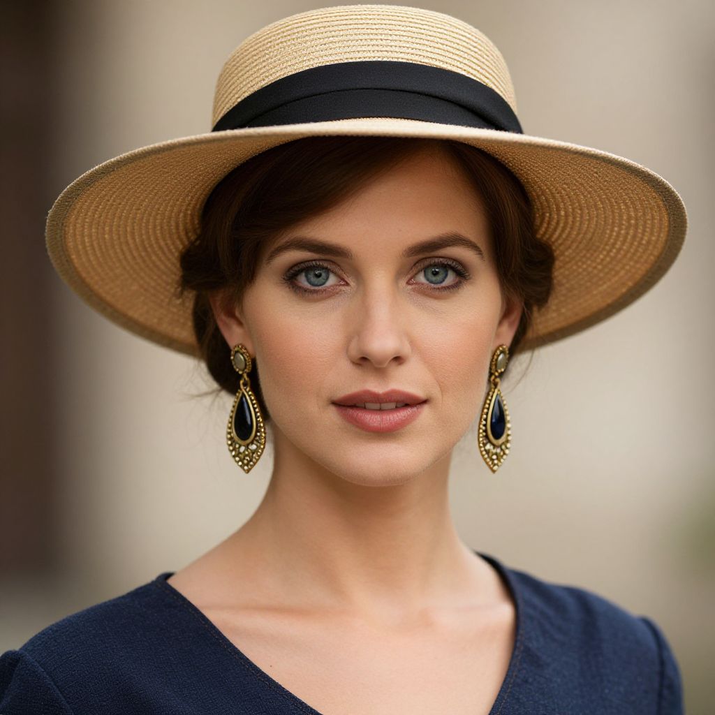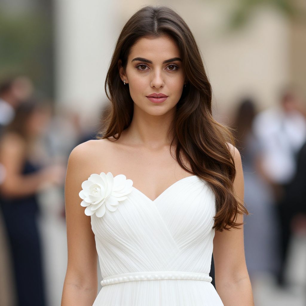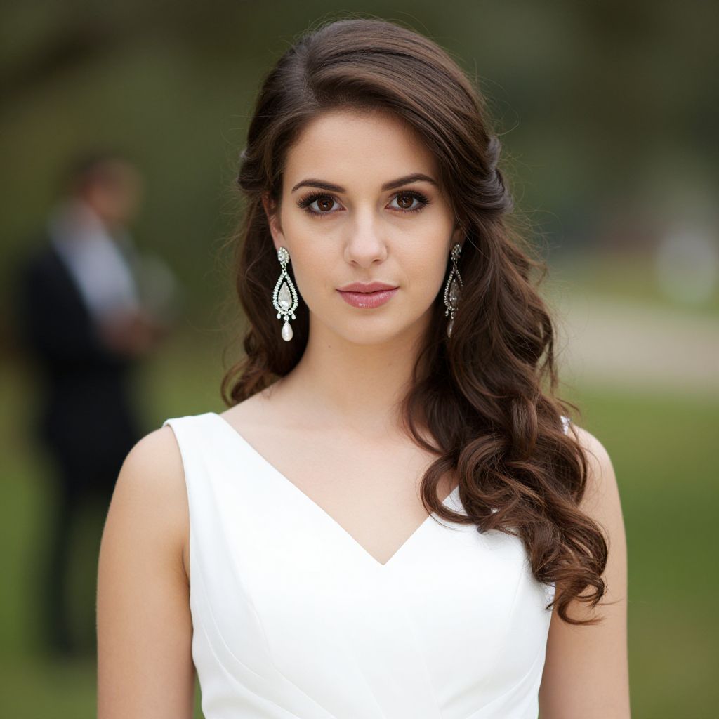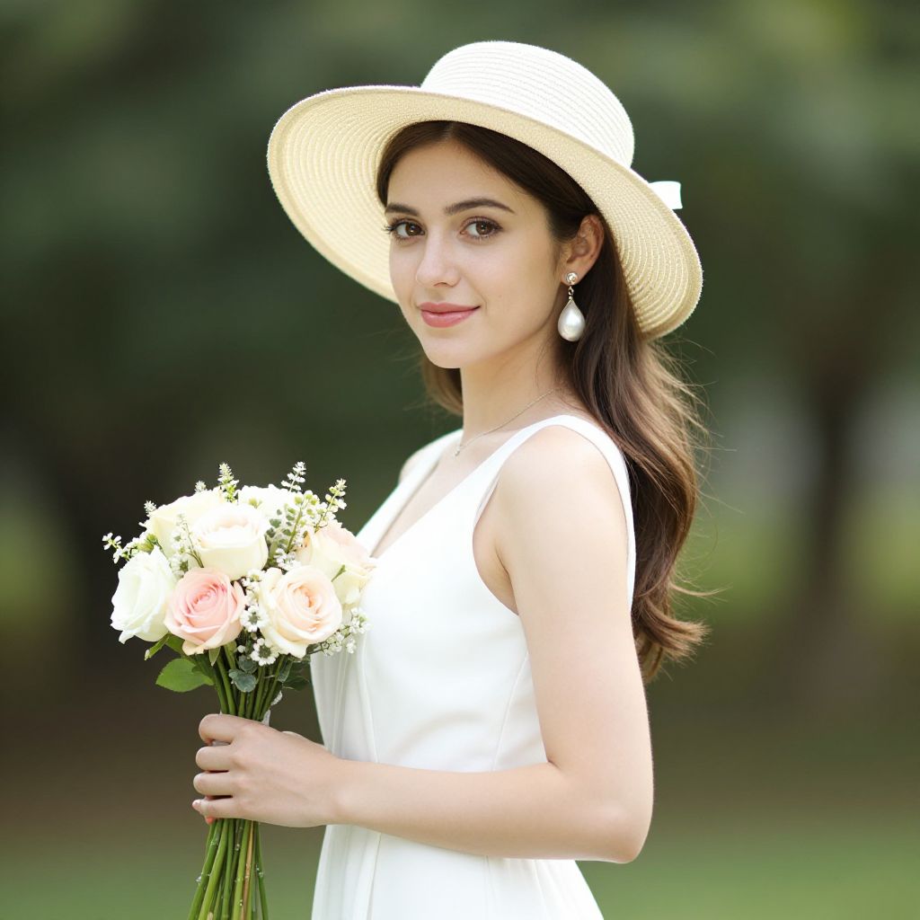 Tea party costume, 1girl, solo, hat flower, earrings, flower, hat, blurry background, looking at viewer, jewelry, dress, blurry, brown hair, realistic, long sleeves, white flower