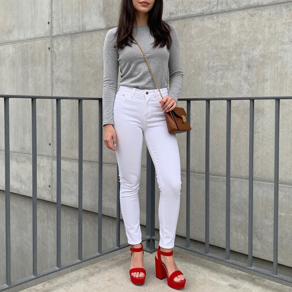 Photograph of a young woman with long dark hair, wearing a gray long-sleeve top, white skinny jeans, and red platform sandals. She holds a brown leather crossbody bag with a gold chain strap. She stands on a metal-railed balcony with gray concrete walls in the background.