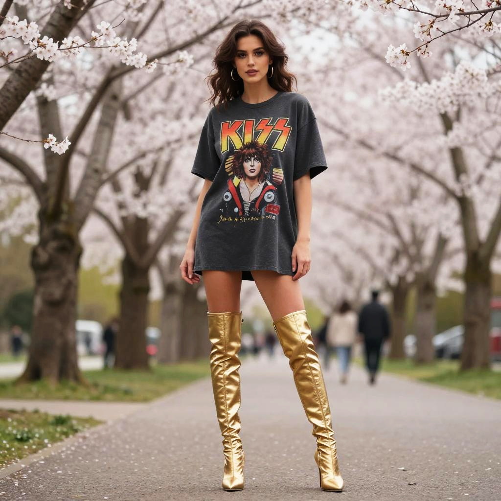 A lean woman in a vintage band tee vibe, wearing an oversized KISS graphic t-shirt and metallic gold thigh-high stiletto boots, stands in a scenic park with cherry blossoms, evoking the visual style of One Peace Books. Sexy. Pretty face and beutiful eyes