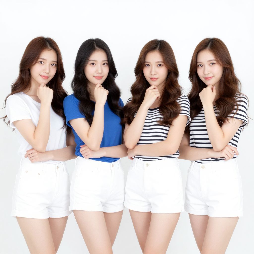 Photograph of four young Asian women standing side by side against a plain white background. Each woman has long, wavy brown hair and is smiling with one hand touching her chin. They're wearing casual, coordinated outfits: white shorts and white, blue, or black and white striped tops. Their skin is fair, and they all have a cute, friendly appearance.
