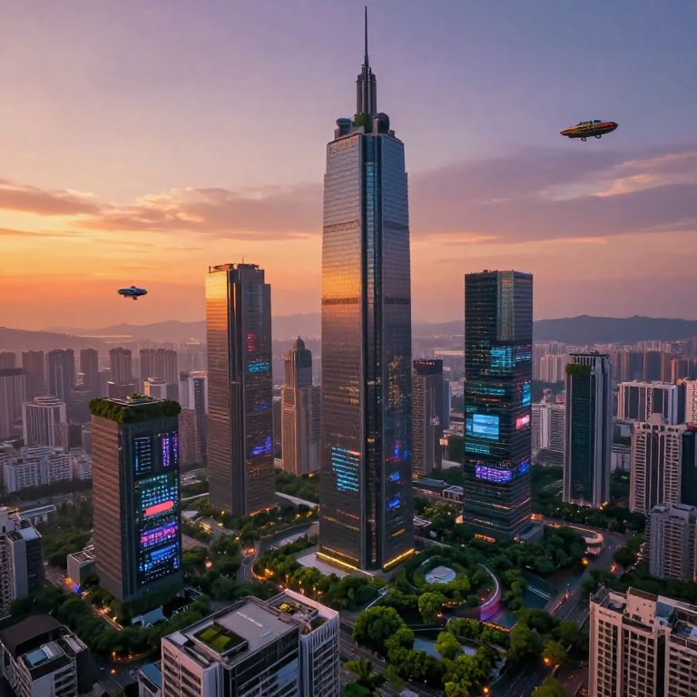 Photograph of a futuristic cityscape at sunset, featuring a tall, reflective skyscraper with a spire in the center. Surrounding buildings are illuminated with neon blue and purple lights. Two flying saucers hover in the orange and purple sky. Green trees and roads are visible at the base of the skyscrapers. The background shows a hazy horizon with distant mountains. The image combines realistic and sci-fi elements with vibrant colors and sharp contrasts.