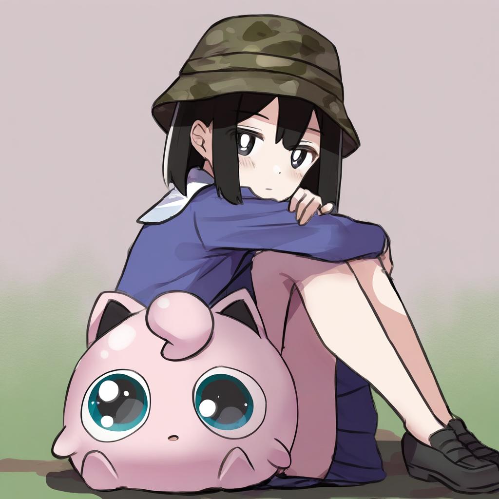 Asakusa midori, eizouken ni wa te wo dasu na!, 1girl, black eyes, hair between eyes, short hair, black hair, school uniform, school uniform, blue jacket, blue skirt, pleated skirt, bucket hat, camouflage headwear, long sleeves, by artist shipii (jigglypuff), leet