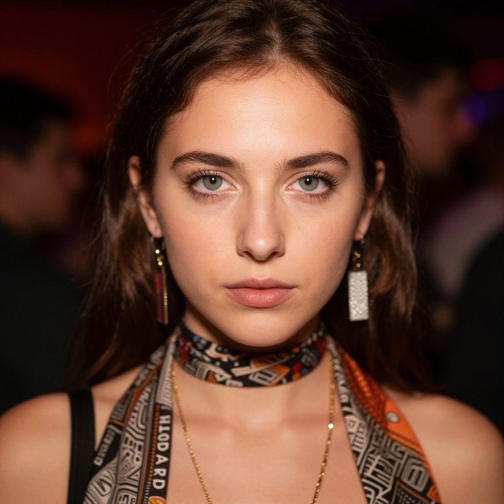 Photograph of a young woman with fair skin and long, dark brown hair. She has striking blue eyes, full lips, and is wearing subtle makeup. Her outfit includes a black and patterned halter top, a matching choker, and gold hoop earrings. She is also wearing a gold necklace. The background is blurred, with dark, indistinct shapes suggesting an indoor setting. The lighting highlights her face, creating a soft glow on her skin. She gazes slightly to the side with a neutral expression. The overall style is modern and chic, with a focus on her facial features and accessories.