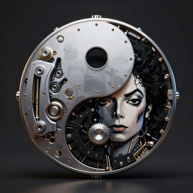 A mechanical yin and yang symbol with intricate bot parts, resembling Michael Jackson's face, set against a dark background.