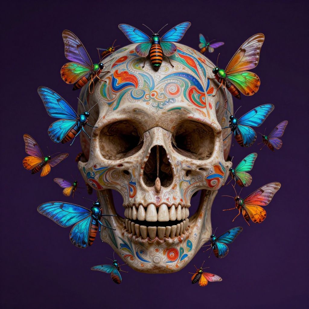 A surreal, photobashed image featuring a skull encased in a watch, surrounded by vibrant flowers and intricate, dark foliage.