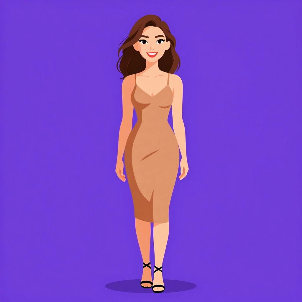 Woman with pretty face and pretty hair. smiling Woman, chic, royal blue sheath dress, knee-length, sleeveless with thin straps, fitted silhouette, straight neckline, black strappy high-heeled sandals. --sref 1467